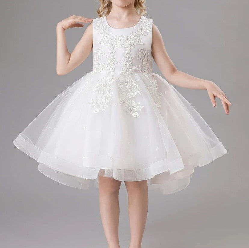 This delicate light ivory dress for girls features an asymmetric skirt that is longer at the back. The bodice is adorned with tasteful embellishments. Combining modern and timeless elements, this dress will make your little girl feel elegant and confident.