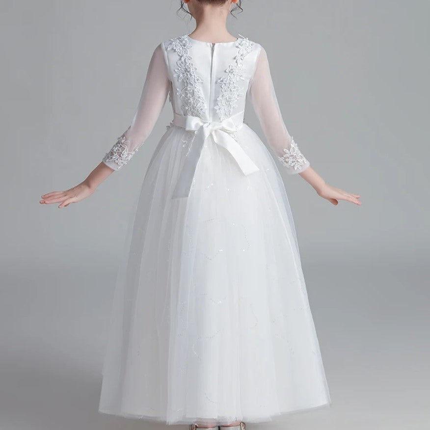 This light ivory girl dress is perfect for colder season events like weddings, communions, or confirmations. It features long satin sleeves that provide extra warmth and comfort.